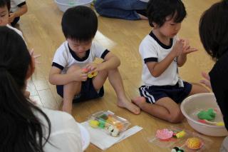 帝塚山大学子育て支援センター(愛称 まつぼっくり)で、幼稚園の2歳児教育対象の親子教室を開催しました。いつものお部屋とは違う施設を利用するとあって、子ども達はちょっと緊張気味にやってきました。「まつぼっくり」のお部屋に入ると、楽しそうなおもちゃや遊具がいっぱいで、とたんに笑顔で遊び始めます!そして、この日は親子で小麦粉粘土つくりに挑戦し、出来上がった3色の粘土を使ってお弁当を制作して楽しませていただきました。ご指導いただきました帝塚山大学松尾先生、、小椋先生、ありがとうございました。次回、子ども達は体操を、保護者には子育てに係るお話をしていただく予定です。