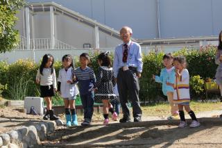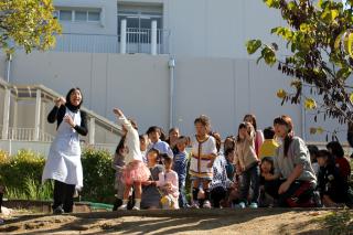 土曜日に『秋の草とばったで遊ぼう!』と題して、元帝塚山中学高等学校理科教諭の中谷隆夫先生に遊んでいただきました。自由参加型の行事にたくさんの虫好きが集まってくれました。ネコジャラシやアカマンマなど秋の草を取り上げて、穂についている粒粒を集めたり、つぶしてみたり…。身近な植物からいろいろ発見がありました。また、オスとメスそれぞれのトノサマバッタを実際に手にして観察したり、バッタ釣り!?にも挑戦しました。なかなかみんな集中して頑張っていました!最後には、園庭の丘から一人ずつトノサマバッタを飛ばしてみました。大きく羽を広げると、あっという間に大空高く飛んでいくものもあって、みんなから大歓声が上がりました。よく飛ぶものは100m以上も飛ぶそうですよ!毎回大好評のこの土曜教室。次回が又楽しみになりました。