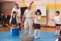 全員でおもちつきをしました。園長先生からは鏡餅の由来についてのお話を、育友会木積会長からはみんなが「おいしくなあれ」と気持ちをこめてつくと、世界で一番おいしいおもちがつきあがるんだというお話を聞き、いっそう張り切る子ども達でした。よいしょ、よいしょの掛け声で一人ずつ杵を持ちおもちをつきました。その後、各クラスで自分のおもちを丸めていきます。そしてお手伝いくださったお母様方の大きなご協力の下、おいしくいただきました。年長組の代表者がつきたてのおもちをいつもお世話になっている学園前交番や学園前駅、警備員さん、大学食堂の皆さんに届けてくれました。