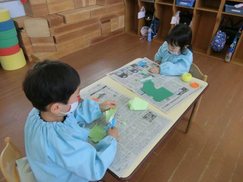 虫捕りに出かけて捕まえてきたバッタと楽しく遊んでいる年少さん。「ほら、見て~」と手にのせたり、チョンチョンと触るととんでいくバッタを「とんだー!」「まてー!」と追いかけて喜んでいます。バッタのお話を読んでもらったり、バッタの制作もしましたよ。