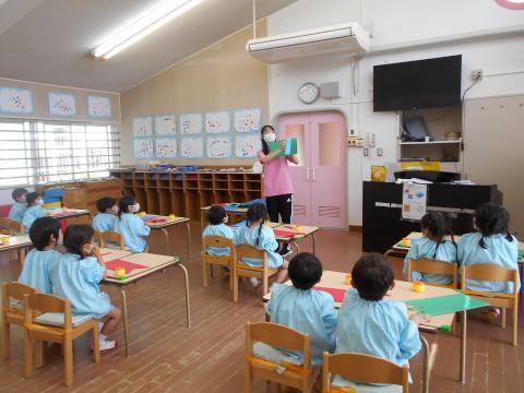 年少さんもこいのぼりを作りましたよ。こいのぼりの鱗は、絵の具で合わせ絵をしたので、半分に折った紙を広げた時には「わぁー!」「きれい!」と声が上がりました。その鱗をハサミでしっぽを切り目をのりで貼ったこいのぼりの体に貼ると出来上がりです。このこいのぼりは帽子にもなっていてかぶることもできます。完成した後はみんなでかぶって大喜びでした。
