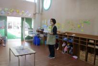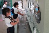 養護の先生より手洗い指導があり、石鹸で手を洗わないとどうなるかのお話を聞きました。その後、手にでんぷんのり(菌に見立てる)を塗って普段通りに手を洗い、水で薄めたイソジン液に浸します。そうすると、洗い残しがはっきりと見えるのです。「わぁー!洗えてなかったとこある!」と驚いていました。目に見えることで子ども達にもわかりやすく、きちんと洗おうという気持ちになったようです。これから意識して洗いましょうね。