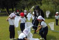 到着後、幼稚園の園庭より広い草原を見て、子ども達は網を片手に、元気いっぱい走り出しました。歩くとバッタが『ピョン』ととび、「いたー!!」「とんだー!!」と嬉しそうに虫捕りを楽しんでいました♪ すると、草の中から「リリリリリ…」と聞こえてきたので、よく見るとコオロギの素敵な音色でした♪「綺麗な音!」「楽しくて歌っているのかな?」と耳を澄ませて聞いていました。