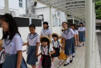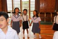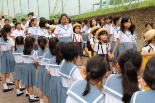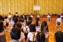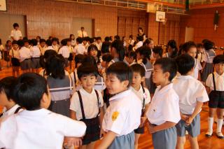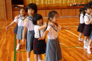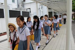 年長組と帝塚山小学校の1年生とが交流しました。朝から、5年生が迎えに来てくれて、手をつないで小学校へ案内してくれました。小学校の玄関前では全校児童がたんぽぽ組、こすもす組の子ども達を歓迎してくれています。ちょっぴりはにかみながら校舎の中へと案内してもらうと、体育館では1年生が笑顔で待っていてくれました。3月まで一緒に遊んでいた『先輩』の顔も見られて、少し安心した年長組さんです。一緒に歌を歌ったり、ゲームをして楽しみました。ずっと優しく手をつないで遊んでくれるお兄さん、お姉さんをきっと頼もしく思えた子ども達でしょう。憧れの1年生、来年までワクワクが続きそうです!帝塚山小学校の皆さん、今日はありがとうございました!