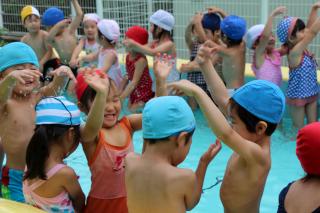 幼稚園でもプール開きをしました。ちょっと冷たい水ですが、初日ということで、水位をぐっと下げて浅い水にしていましたので、子ども達は不安もなく元気に遊ぶことができました。これから毎日天気の良い日にはプール遊びをします。年長組は来週から温水プールでの水泳指導も始めます。夏の遊びを存分に楽しみましょう。