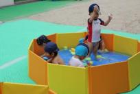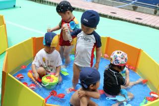 2歳児クラスもお天気と相談しながらプール遊びを楽しんでいます。プールの中には魚やカニなどのおもちゃがぷかぷか浮いていて、それを使って夢中になってみんな遊んでいます。ちょっと水遊びが苦手な子もいますが、先生とプールの外で、水鉄砲をして遊びました。これからもっともっと暑くなって、みんなでもっともっとプールで遊べるといいですね!