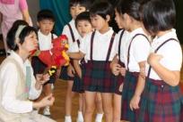 人形劇団クラルテさんによる『あかいめんどり』をリズム室で鑑賞しました。今日は幼稚園の8月生まれの誕生日集会もあり、朝から盛りだくさんです。2歳児クラスの友達も一緒に集まって楽しみました。みんなお話に夢中で、あっという間におしまいになりました。それぞれの保育室にもどるときに、めんどりさんといぬさんが見送ってくれたので、握手をしたり、「ありがとう」「ばいばーい」と声をかけたりして、名残惜しそうにしている子ども達でした。