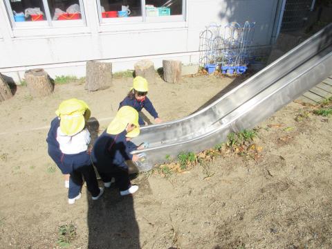 園庭には大きなすべり台があります。今日は、上からどんぐりが滑ってきました。コンコロコン!!」とリズミカルないい音をたててどんぐりたちは、すべり台を勢いよくすべります。みんな大喜びで飛び出すどんぐりをつかまえましたよ。
