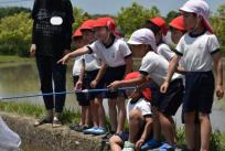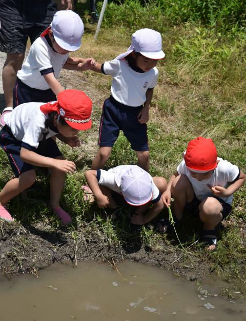 おにぎりをおいしくいただき、お昼からはあぜ道を歩いてカエル捕りをしました。「なかなかいないなぁ」と目を凝らし田んぼの中を覗き込み、カエルを見つけると大興奮の子ども達でした。