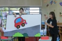 心地よい秋空の広がる日、帝塚山幼稚園2歳児教育の体験会にたくさんの方が遊びに来てくださり、手遊びや親子ふれあい遊び、制作等をしました。赤い自動車が登場するパネルシアターでは、「がんばれ~」と声を出して自動車を一生懸命応援してくれましたね。