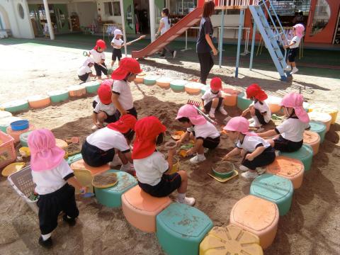 朝晩やっと涼しく感じられるようになってきました。2歳児クラスも砂場に出ることが出来るようになりました。