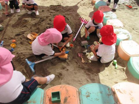 砂場には、年少さんがいて、「いれて!」というと「いいよ!」と返事をしてくれました。スコップを貸してくれたり、一緒に砂を掘ったり、楽しかったね!