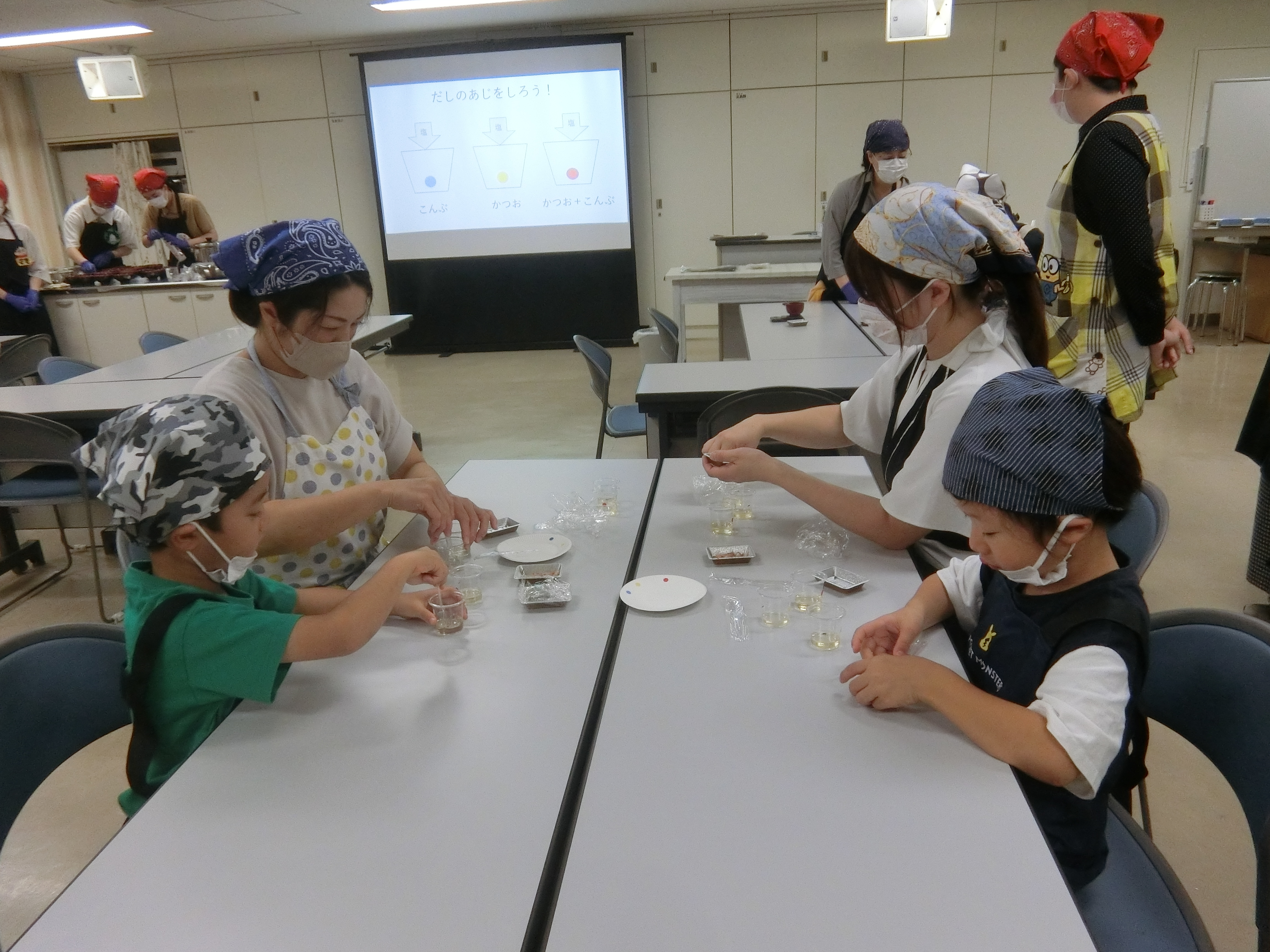 年長児対象で帝塚山大学食物栄養学科の新宅先生と学生による親子で出汁を味わう会がありました。
