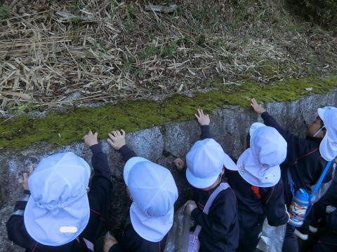 どんぐりが転がっている足もとには、ふわふわの苔も広がっていて、「やわらかいね!」「気持ちいい」と触ってみる子どもたち。苔を見つけるたびに、「ここにも苔ある!」「苔の上でどんぐり寝てるね」「ふわふわで気持ちいいんちゃう?」と可愛らしいつぶやきをたくさん聞かせてくれました。緑の苔の上に転がる緑色のどんぐりを見て、「かくれんぼしてるね」と話す子もいて、子どもたちの豊かな感性に思わず笑顔がこぼれました。