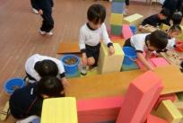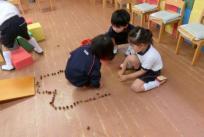ほかにも、友だちと協力しながらどんぐりを立てて長くつなげて並べてみたり、形にしてみたりそれぞれが思い思いにどんぐり遊びを楽しんでいます。