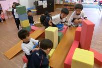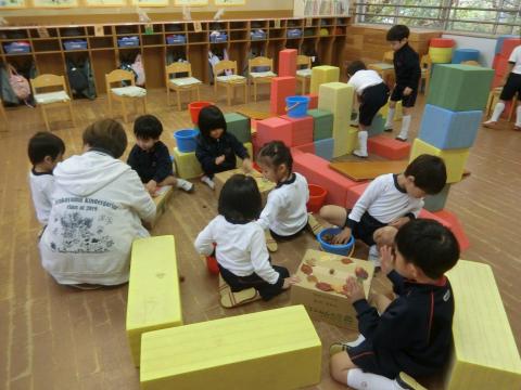 朝の自由遊びの時間、子どもたちはどんぐり遊びを楽しんでいます。段ボールで作った土俵を囲んで「はっけよーい、のこった!」と声を合わせ、トントントンと土俵をたたきながら、真剣勝負でどんぐり相撲を繰り広げています。自分のどんぐりが勝つと「やったー!」と大喜びし、負けても「もう一回!」と何度も挑戦!諦めずに取り組む姿に熱い気持ちが伝わってきます。