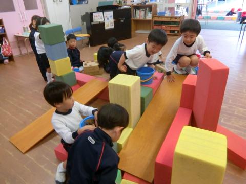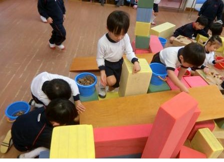 また、積み木や板を使ってどんぐりのすべり台やコースを作る遊びも大好きです。「ここにジャンプ台をつけよう!」「この穴に落ちたらアウトね!」と友だちと相談しながら、コースをどんどん工夫している姿はとても楽しそうです。転がるどんぐりの動きをじっと見つめ、「先生!今のどんぐり、コンコンコンって跳ねて転がった!」と目を輝かせて教えてくれる時の子どもたちの表情はとても生き生きとしています。
