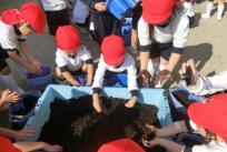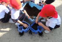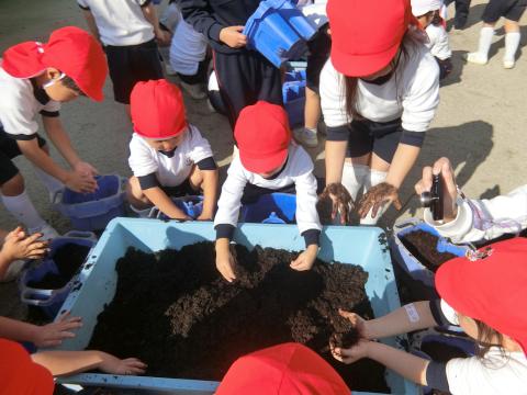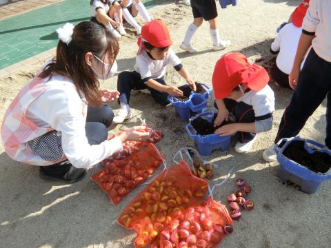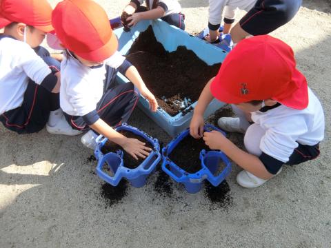 チューリップの球根を植えました。年中さんは、用意してある球根を見て「これ見たことある」「チューッリップや!」と言って、昨年、球根を植えたことを覚えていましたね。 子どもたちが年長組になった時に咲くことを話すと、「早く咲いてほしい!」「年長さん!?楽しみ~」と嬉しそうにしていました。