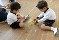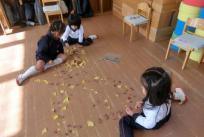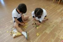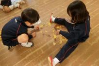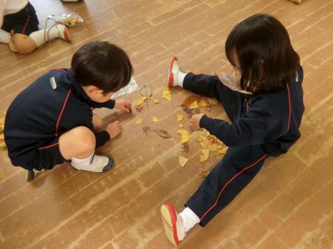 葉っぱ遊びでは、葉っぱをコースのように並べて、“葉っぱの道”を作り、どんぐりを転がしてゴールを目指すアスレチック遊びを考える子、葉っぱを『赤ちゃん葉っぱ』『お兄さん葉っぱ』『お母さん葉っぱ』と分けて並べる子、お友だちの葉っぱと合わせて葉っぱいっぱいにしてふかふかの“どんぐりのベッド”を作る子など、思い思いに発想を広げていて、子どもたちの成長を感じます。