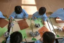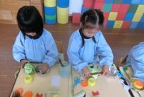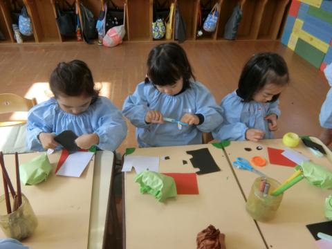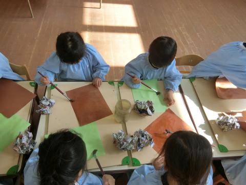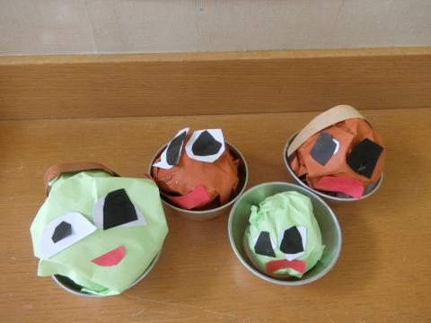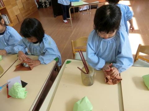 そんな遊びから広がって、立体制作のどんぐり作りにも挑戦しました。新聞紙を丸めたり、画用紙を貼ったり、目や口を付けて“自分だけのどんぐり”を作りました。