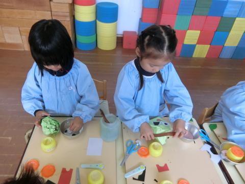 年少組の子どもたちは、絵本「どんぐりひろば」が大好きです。太っちょどんぐり・細っちょどんぐり・おちびどんぐりになって、“くるくるバレリーナ”“お相撲ごっこ”“かくれんぼ”を身振り表現して楽しんでいます。