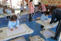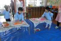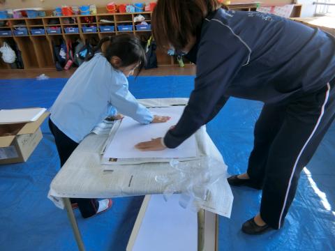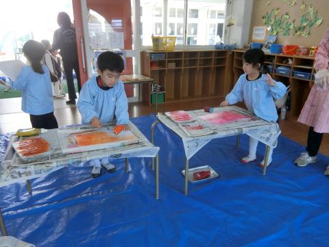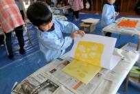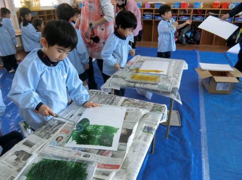 印刷する時は、ローラーでコロコロして色がついていくのが楽しく、紙をのせて擦る時には真剣な表情でした。描いた絵が白く浮き出てきたことにも驚いていましたね。ゆっくりと紙をめくっていくと「わぁ!できた!」と嬉しそうな子どもたちでした。作品は制作展で展示します。