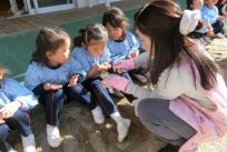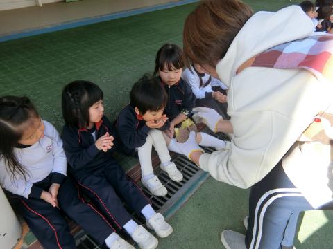 「焼けたよ!」と声が掛かると大急ぎで子どもたちは外へ駆け出していき、焼き立てのお芋を見ようと必死! 焼きたての焼き芋を小さく手に乗せ、「アツアツや!」「美味しすぎる! おかわり!」と大喜びでした。あっという間に焼き芋を完食! ホクホクの焼き芋を食べて、心も温かくなった幸せな時間でした。