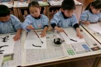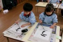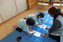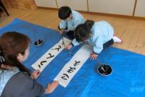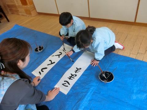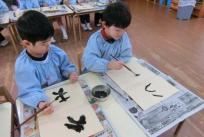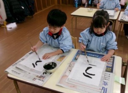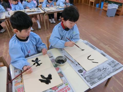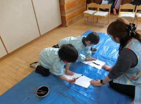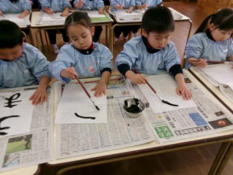 先生のお手本を見ながら半紙に墨で書きます。指でなぞったり、何度も練習した後、しっかりと筆に墨をつけて、真剣に書いていた年中さんでした。年長さんも書初めに挑戦し、目標を文字に表現しました。