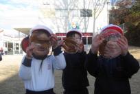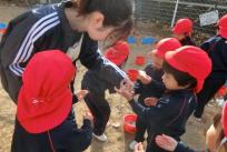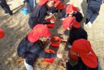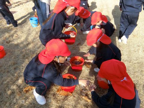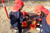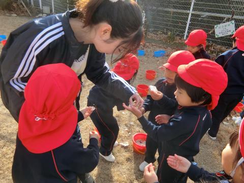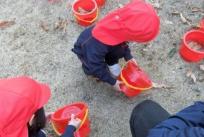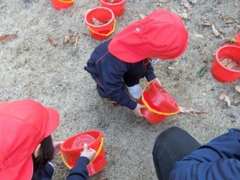 「明日からすごく寒くなるらしいよ。バケツに水を入れて氷を作ってみる?」と声をかけると、「作りたい!」と子どもたちは大張り切り。自分のバケツに水を入れると、その中に葉っぱやどんぐりを入れて工夫する姿も見られました。「氷ができますように」と願いを込めながら、日の当たらない日陰にバケツを並べて準備完了!