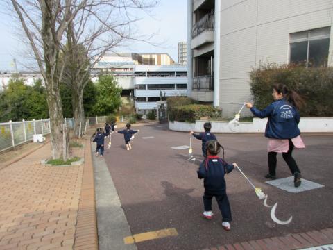 2歳児クラスは、へびの凧を作ってくるくる回して遊びました。