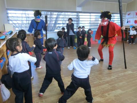 「生駒の山から鬼が来たぞー!!!」という声が幼稚園に聞こえてきました。そして、ドン!ドン!と音が鳴り、お部屋に鬼がやってきました。「鬼は外!」と豆を投げて勇敢に戦う子、走って逃げまわる子、先生の後ろに隠れる子、泣いてしまった子と様々でした。