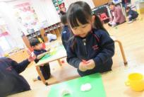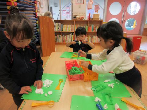 2歳児クラスのみんなは、粘土遊びが大好き!夢中なってこねこねします。