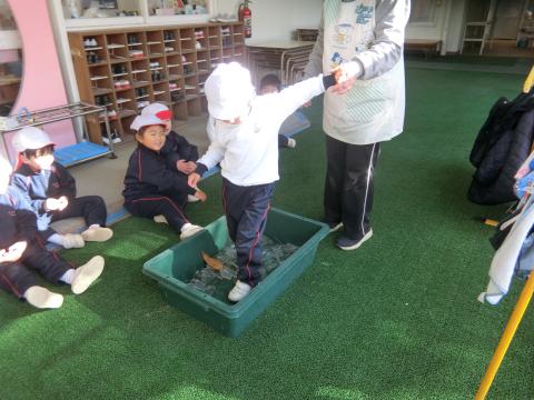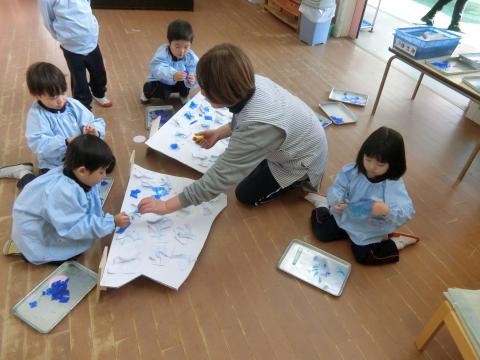 ぺんぎんのお父さんやお母さんが海で魚を捕る場面を思い浮かべながら、魚やオキアミ(エビ)を作り、お道具の海に泳がせてあげました。「お魚はこっち向きに泳いでるよ!」「オキアミはこの辺にいてる!」と、可愛らしいつぶやきも聞かれ、一匹ずつに思いをもっている姿が微笑ましかったです。