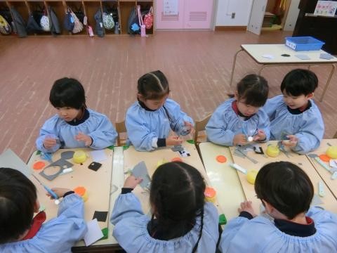 生活発表会に向けて、子どもたちは毎日お話『ぺんぎんのぺんぼうや』のごっこ遊びを楽しんでいます。お話遊びと並行して、お道具や壁面制作にも意欲的に取り組んでいます。