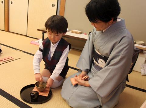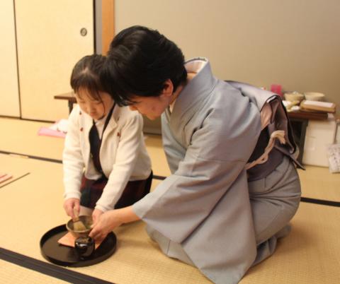 5月から裏千家流尾崎宗栄先生・岡本先生にご教授頂き、最終日の1月27日(火)・29日(木)は保護者をお客様としてお迎えして、相生(あいおい)という御銘の茶菓子と子ども達が心を込めて点てたお茶を味わって頂きました。一生懸命な子ども達のおもてなしの姿に1年間の成長を感じ、笑顔がこぼれる和やかなお茶会でした。この一年、四季折々の季節の花や茶菓子の御銘、意味を教えて頂き、先生と楽しいお茶の時間を過ごしました。