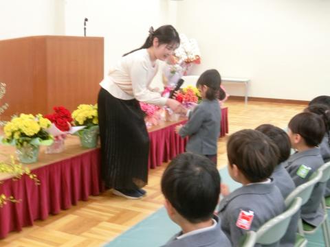 今日は修了式でした。みんなは、たくさんの「好き!」「できた!」が増えました。また、たくさんの自然に触れ、感じたことや気づいたことをお友だちに伝えたり、みんなと一緒に楽しく遊んだりしていく中で大きく成長しましたね。