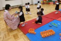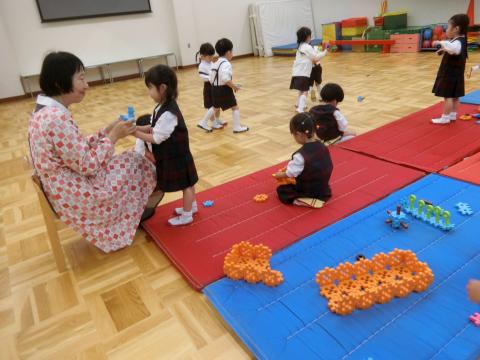 保護者会が行われているあいだ、年少のお友だちは、2歳児の先生と遊びました。