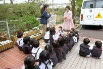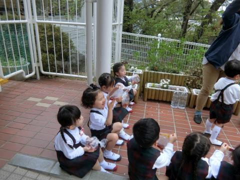 その後、外に出て花壇の落ちている赤と黄色のチューリップの花びらを拾ってビニールの袋に入れると、先生がお水を入れてくれました。それを一生懸命揉んでいくと・・・ あら不思議!お水の色が赤や黄色に変わっていきます。「赤いジュースになった!」「リンゴジュースや!」「私のは黄色いジュース!」と大喜びでした。
