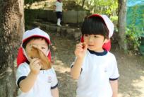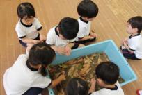 入園して約2週間余りの年少さんが、園庭でだんご虫を見つけました。大きなたらいに土を入れて、だんご虫さんの家を作りました。「枯れた葉っぱやどんぐりも好きかな?」「モジャモジャしたのも喜ぶかな?」と、家に入れてあげます。