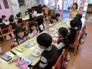 年少組2クラスが一緒に給食をいただきました。いつもと違う友達と食べると、又ちょっと違った雰囲気で楽しそうでした。「おかわりします」という子もいつもよりたくさんになっていたようです。