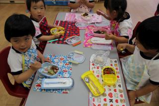 2歳児クラスのお弁当の時間が始まりました。お家の方に作っていただいたおいしそうなお弁当が並びます。みんなで一緒に食べることが少しずつ楽しくなっていくと良いですね。