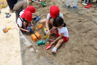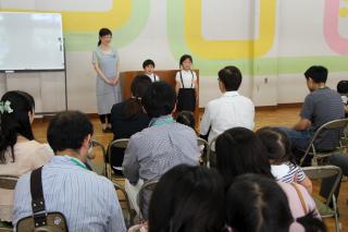 年長組の子ども達が体験保育の参加者と一緒に制作や外遊びをしました。前日から小さな友達が遊びに来てくれる!と楽しみにしていた年長組さんたち。「こうやってするんだよ」「一緒においで」と、声をかけながら優しく接してくれた子も多く、どうやって接したらいいか、戸惑いながらも一生懸命係っている子ども達でした。もしかしたら参加者の皆さん以上に年長組の子ども達にとって、とても有意義な時間になったかもしれません。『帝塚山幼稚園に又遊びに来て下さい』と代表園児が挨拶すると、参加者の皆様から暖かな拍手を頂戴しました。皆様、本当にありがとうございました。