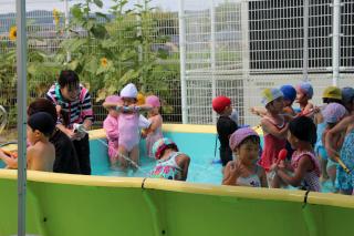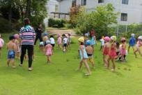 プールで遊ぶ前に、芝生のお庭で念入りに準備体操です。水鉄砲で今日は思いっきり先生に水をかけて遊びました!