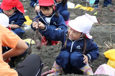 多賀フルーツラインにおいも掘りに行きました。バスに揺られてのどかな山間の農園に到着です。早速スコップで掘っていきますが、なかなか掘り上げられなくて苦労している様子です。少しずつお芋の頭が見え出すと、一生懸命周りの土をどけていき、ようやく手で引っ張れるくらいになりました。うーん!と力を入れて引っ張ってみると、大きなお芋がたくさん出てきました!「先生、出てきた!」と嬉しそうな子ども達の声があちらこちらから聞こえます。袋にたくさんのお芋を詰め込んで、幼稚園に戻ってきました。