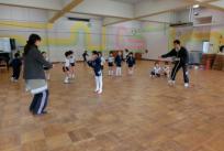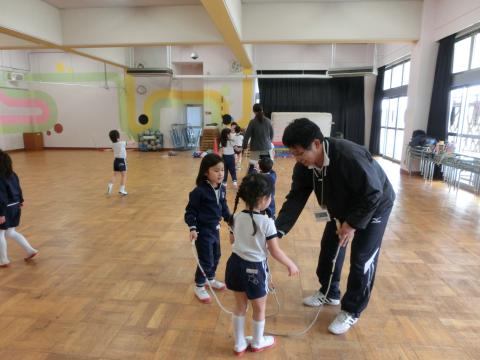 縄跳びでひとり跳び、ふたり跳び、そして大縄跳びにも挑戦です。ちょっぴり難しいけれど、リズムをつかめると、だんだん楽しくなってきました。サーキット遊びやボールでドリブル、走ってキャッチなど盛りだくさんの内容で、時間内、全身を使っての運動です。年中組さんは年長組さんのスピードに圧倒されながらも、仲良く取り組んでいます。