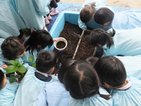 みんな赤いいちごがなるのを楽しみにしています。頑張ってお世話しようね。
