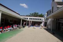 先日の参観日に年長組がボーディーペインティングしたこいのぼりが4匹元気よく空を泳いでいます。