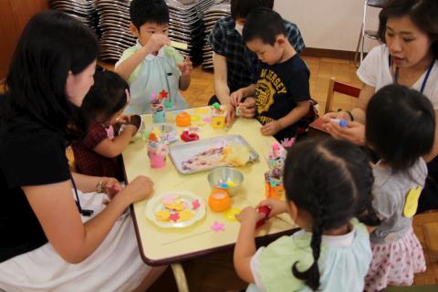 6月13日(土)の初夏の体験保育には、たくさんのお友だちが帝塚山幼稚園に遊びに来て下さり、年長組と一緒にカップケーキの制作をしました。モコモコ毛糸のクリームをつけたり、ビーズやかわいい形に切った色紙で飾り付けをしたりして、おいしそうなカップケーキが出来上がりました!! 園庭でも年長組と砂場遊びをしたり、お池の金魚に餌をあげたりして、遊びました。