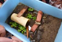 子どもたちは、カエルが大好き。「待て待て」と跳んで逃げるカエルを追いかけることに夢中になっていました。捕まえると手にそっと乗せて「むにゅむにゅして気持ちいい。」「かわいい。」と嬉しそうでした。「ずっとケースの中の家だと狭くてかわいそうだから、広いおうちにしてあげよう。」という声が上がり、カエルのことを想いながら、協力してタライの中に広くて楽しいおうちを作りました。