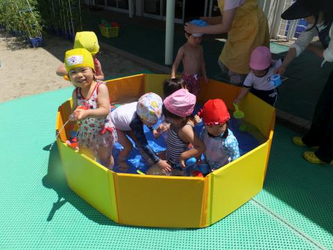 体操をしてから、園庭のプールで遊びます。お友だちと一緒に水鉄砲をしたり、お魚すくいをしたり、おもちゃのジョウロで遊んだり、思い切り水の感触を楽しみました。